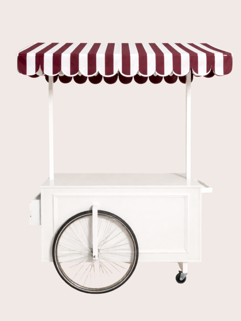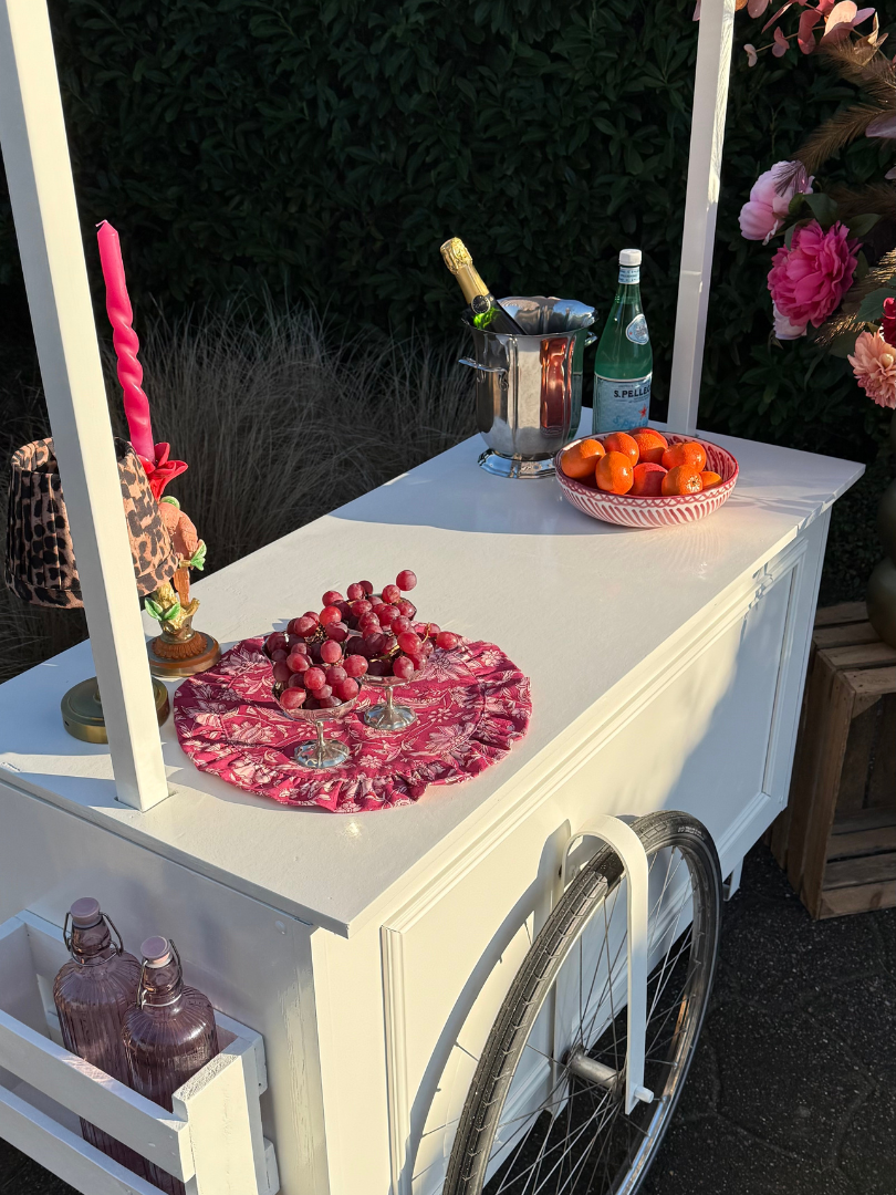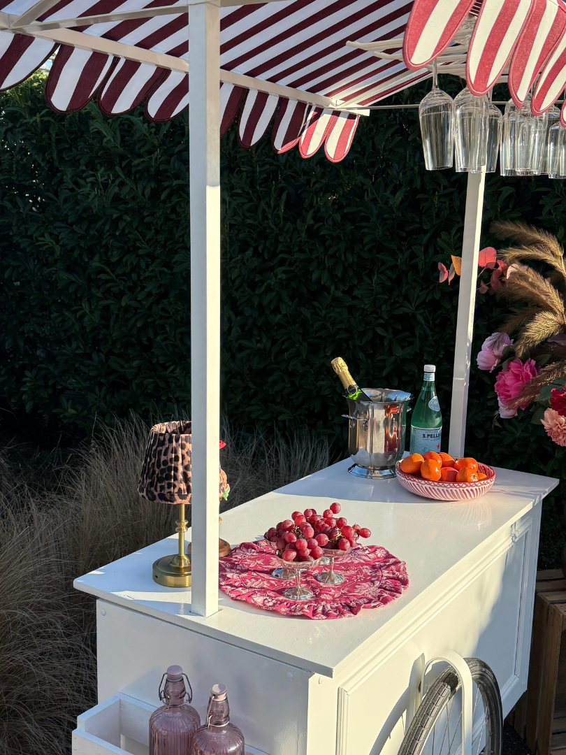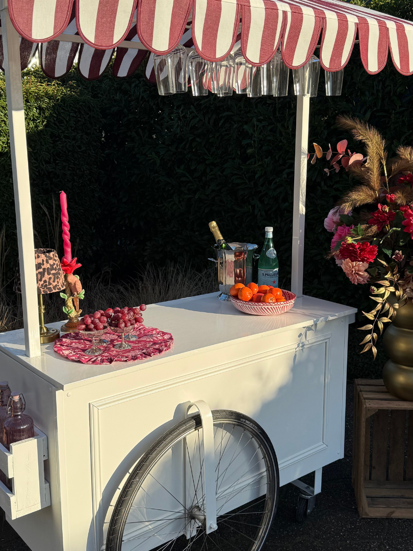 Onze cocktailkar is een echte sfeermaker. Met haar frisse witte basis en charmante gestreepte luifel geeft ze ieder event direct een gezellige, stijlvolle touch. Perfect voor het serveren van cocktails, mocktails, koffie of een feestelijk glas bubbels. Of het nu gaat om een bruiloft, tuinfeest of event: deze cocktailkar nodigt uit om samen te komen en te genieten.