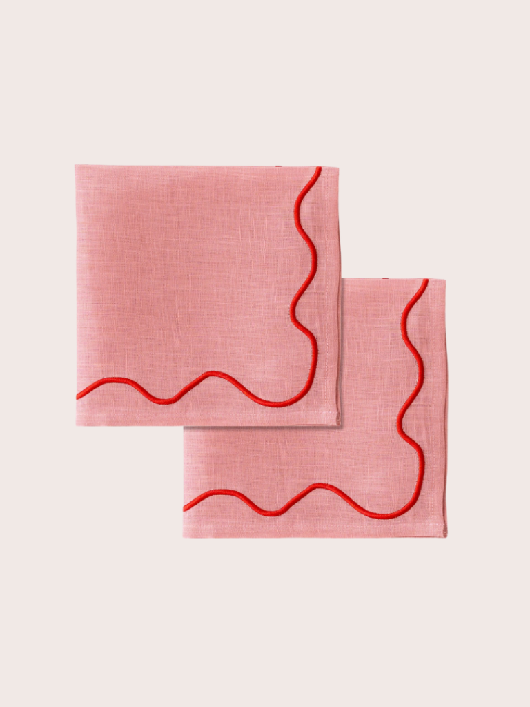 Breng subtiele charme aan tafel met dit servet in een zachte roze tint, afgewerkt met rood wavy borduurwerk. De combinatie van fris en elegant zorgt voor een speelse maar verfijnde uitstraling. Perfect om elke tafelsetting nét dat beetje extra kleur en karakter te geven.