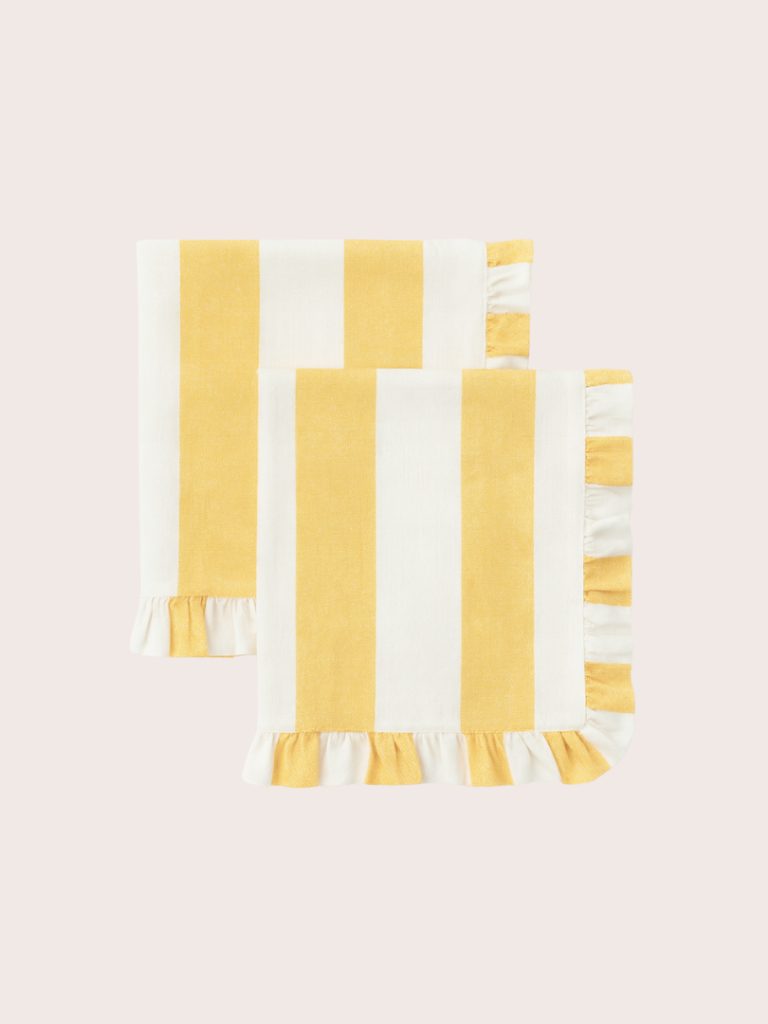 Breng instant vrolijkheid aan tafel met deze zonnige servetten met speelse volant. Ze geven elke setting een warme, uitnodigende uitstraling. Perfect voor zomerse lunches, feestelijke diners of gewoon om je dagelijkse tafel nét dat beetje extra charme te geven. Een kleine touch met groots effect!