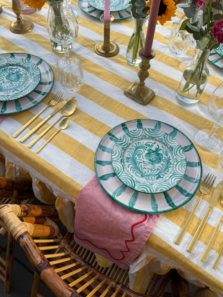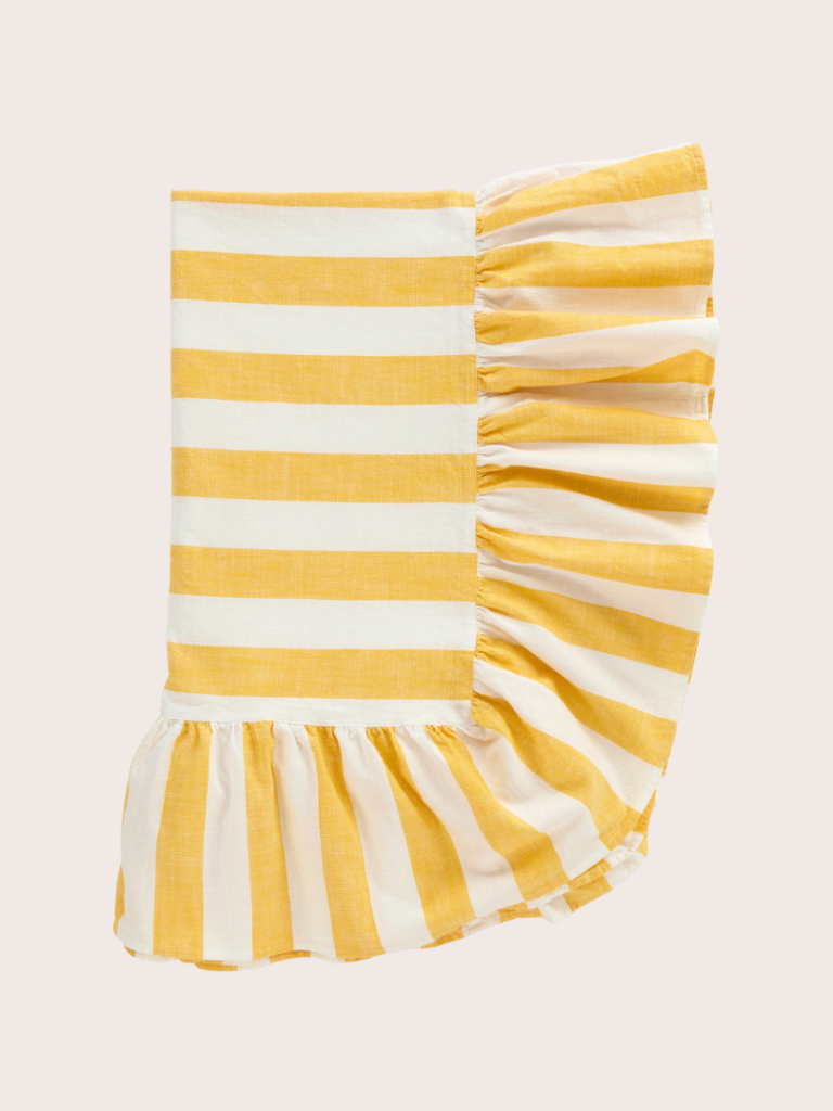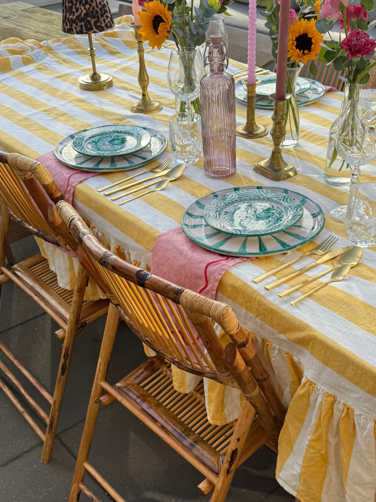 Breng een zonnige glimlach aan je tafel met dit zachtgele tafelkleed! De vrolijke volant geeft meteen een speelse, uitnodigende touch. Perfect voor lange zomerlunches, spontane borrels in de tuin of elke moment waarop je net wat extra gezelligheid wilt creëren. Laat je tafel stralen en maak van ieder etentje een zomers feestje.